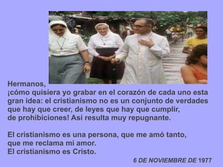 Este documento contiene una colección de homilías y discursos del arzobispo Oscar Romero de El Salvador entre 1977-1980. En ellos, Romero enfatiza que el cristianismo es una persona (Cristo) y no solo un conjunto de creencias o leyes. También critica una religión que solo se preocupa por el culto dominical pero no por la justicia social, y una iglesia que busca riquezas en lugar de servir a los pobres. Finalmente, expresa su compromiso con los derechos humanos a pesar de las amenazas contra su
