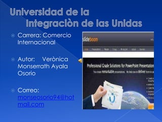 El documento describe las características y ventajas de SlideBoom, un servicio en línea para compartir presentaciones de PowerPoint. SlideBoom permite almacenar presentaciones en formato PPT o PPS de hasta 30MB y cuenta con herramientas como un lápiz virtual y resaltado de diapositivas. Se diferencia de SlideShare en que mantiene las animaciones y transiciones entre diapositivas.