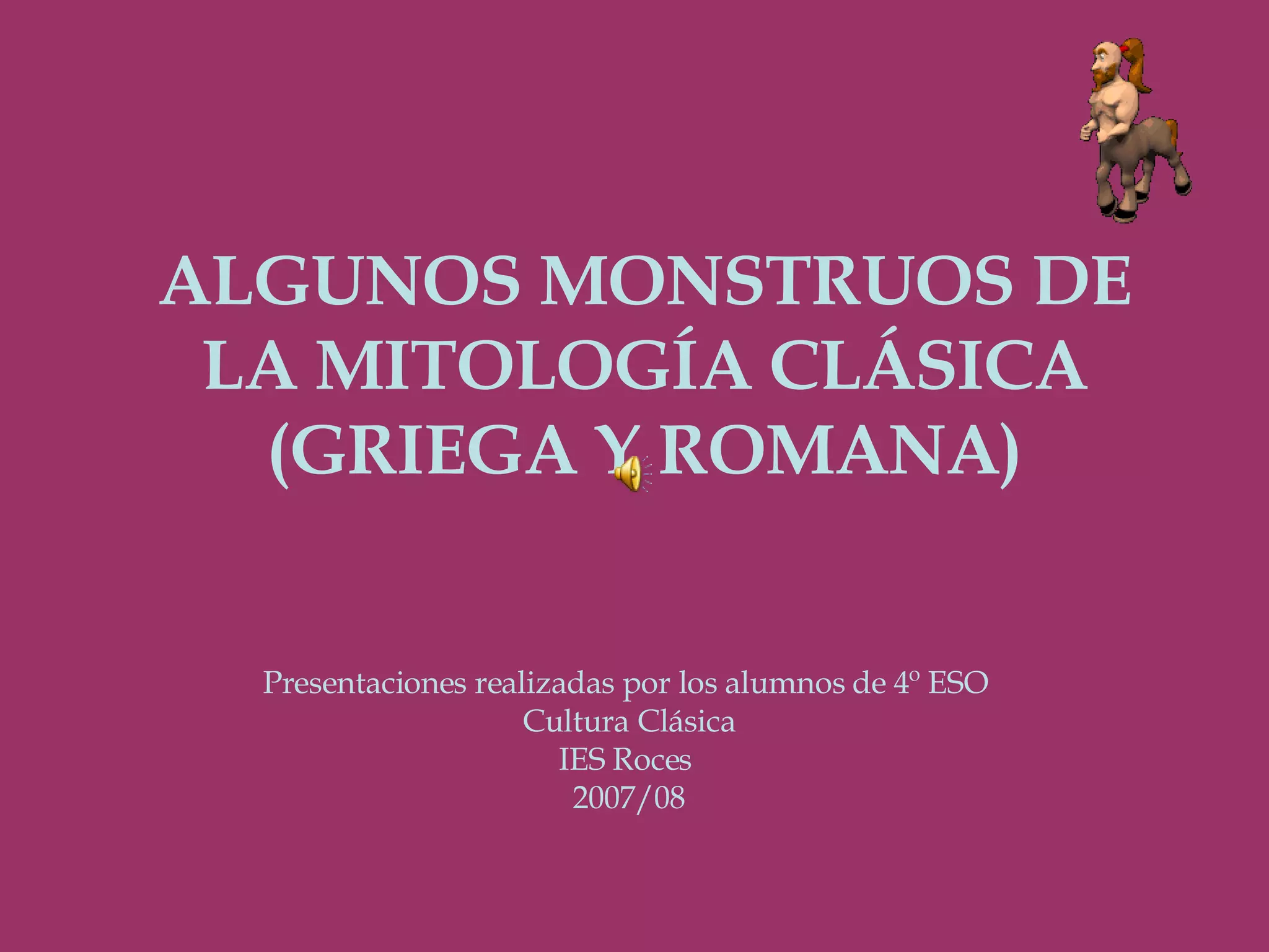 El documento presenta una serie de monstruos de la mitología clásica griega y romana. Describe al centauro Quirón, que fue educador de Aquiles a pesar de ser un ser mitad hombre y mitad caballo. También habla de la Hidra de Lerna, un monstruo acuático con múltiples cabezas que fue derrotado por Hércules, y de la Esfinge que planteaba acertijos a los viajeros en Tebas hasta ser vencida por Edipo.