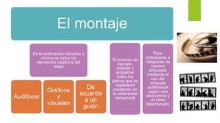 El documento describe los diferentes tipos y técnicas de montaje cinematográfico. Explica que el montaje es el proceso de seleccionar y ordenar planos filmados de acuerdo a un guión para crear una narrativa coherente. Luego detalla varias clasificaciones de montaje como montaje narrativo, ideológico, creativo, expresivo y rítmico. También cubre conceptos como el montaje sonoro, imperceptible, el uso del tiempo y espacio, y formas de trabajar el montaje como la moviola y métodos digitales.