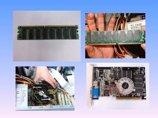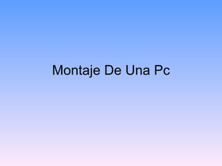 El documento describe los pasos para montar una PC, incluyendo colocar la placa base, el microprocesador y el ventilador; instalar la memoria RAM, la tarjeta gráfica, el disco duro, la unidad de disquetes, la unidad óptica y la grabadora; conectar los periféricos como el teclado, ratón y monitor; y por último, instalar el sistema operativo. Se ofrecen advertencias para cada paso para evitar errores en el proceso de montaje.