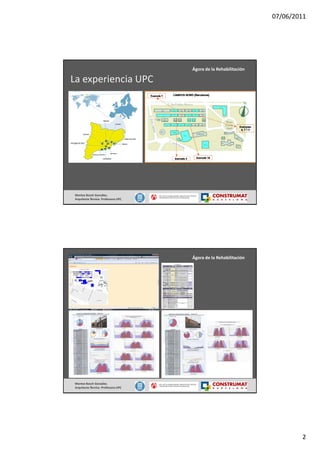 El documento presenta una charla sobre auditorías energéticas realizadas en edificios. La expositora ha realizado 27 auditorías a través de proyectos universitarios y municipales en Sabadell. Las auditorías analizan el consumo energético de edificios y proponen medidas para mejorar la eficiencia, como limitar la demanda a través del envolvente o mejorar el rendimiento de las instalaciones. La expositora destaca la necesidad de nuevas herramientas para la gestión energética del parque edificado existente.