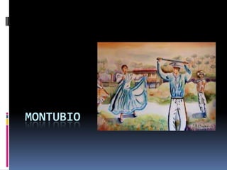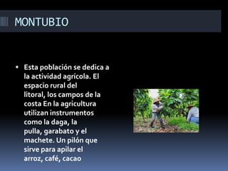 Este documento describe a la población montubia de Ecuador. Se dedican a la agricultura utilizando herramientas como dagas, garabatos y machetes. Viven en casas de caña guadua u hojas de plátano cerca de los ríos para comercializar sus productos. Los hombres usan pantalones cortos y las mujeres faldas coloridas y blusas blancas. Debido a la opresión histórica, son cautelosos y desconfiados, y los hombres tienden a ser machistas y promiscuos, especialmente cuando consum