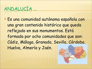 Andalucía es una comunidad autónoma del sur de España formada por ocho provincias con una gran riqueza histórica y natural reflejada en sus numerosos monumentos y parques naturales. Sus símbolos principales son la bandera blanca y verde y el escudo de Hércules, y celebra su día el 28 de febrero.