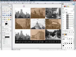 El documento describe los pasos para editar fotos de monumentos en Madrid para crear un collage. Primero se selecciona el monumento, se copia la selección a una nueva imagen, luego se usa la herramienta de clonado para eliminar personas, y finalmente se aplica un filtro antiguo antes de combinar las imágenes en un collage con un título logotipo.