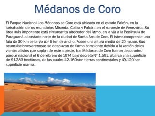 El Parque Nacional Los Médanos de Coro se encuentra en el estado Falcón de Venezuela y abarca un área de 91.280 hectáreas, incluyendo 42.160 hectáreas de tierra y 49.120 hectáreas marinas. Los Médanos de Coro consisten en dunas de arena que se mueven debido a los vientos alisios entre el istmo de 30 km de largo y 5 km de ancho cerca de la ciudad de Santa Ana de Coro.