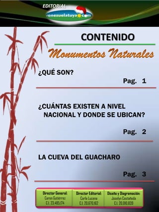 Venezuela protege el 46% de su territorio a través de Áreas Bajo Régimen de Administración Especial que conservan recursos naturales como el agua y apoyan la generación de energía. Existen 36 monumentos naturales en Venezuela, incluyendo La Cueva del Guácharo, declarada el primer monumento natural en 1949 para proteger su geología y biología única. Con más de 10 km de galerías y salones de hasta 30 m de ancho, alberga diversas especies de murciélagos, ratones, cangrejos y el guácharo,