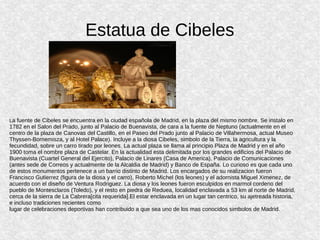 La fuente de Cibeles se encuentra en el centro de Madrid y representa a la diosa Cibeles sobre un carro tirado por leones. La plaza Mayor es otro importante monumento en el centro histórico de la ciudad, mientras que el Museo del Prado y el Palacio Real albergan importantes obras de arte y son lugares históricos. Otro monumento notable es la Puerta de Alcalá, ubicada en uno de los accesos a la ciudad.