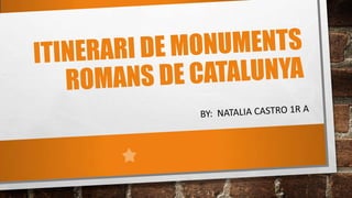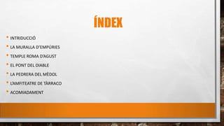 Este documento presenta información sobre varios monumentos romanos en Cataluña, incluyendo la muralla de Empúries del siglo I a.C., el templo romano de Augusto en Barcelona del siglo II d.C., el puente del Diablo en Martorell del siglo I d.C. que formaba parte de la Vía Augusta, la cantera de piedra en Mèdol que se usaba para construir edificios en Tarragona, y el anfiteatro de Tarragona del que no se conocen las dimensiones exactas. El documento concluye agradeciendo la