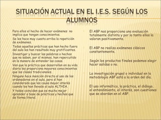 El autor reunió a compañeros docentes y estudiantes de 4o grado para evaluar la situación actual del aprendizaje y considerar la metodología de Aprendizaje Basado en Problemas (ABP). Los estudiantes indicaron que las prácticas fuera del aula les resultaron más gratificantes que los exámenes. También comentaron que aprenden más de la investigación independiente y de las actividades de la vida diaria que de las clases tradicionales. Discutieron los beneficios potenciales de aplicar la metodología ABP en el cent