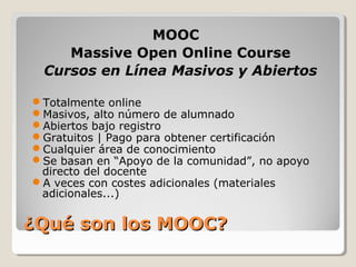 Los MOOCs (Cursos Masivos Abiertos en Línea) son plataformas educativas que ofrecen cursos gratuitos o de pago a gran escala, donde los estudiantes pueden acceder a un contenido diverso y colaborar con otros. Aunque promueven la democratización de la educación y la internacionalización de la enseñanza, enfrentan críticas por su formato masificado, la falta de apoyo docente y la posibilidad de desigualdades en el aprendizaje. El debate sobre su efectividad, rentabilidad y el papel del docente continúa siendo relevante en el contexto educativo actual.