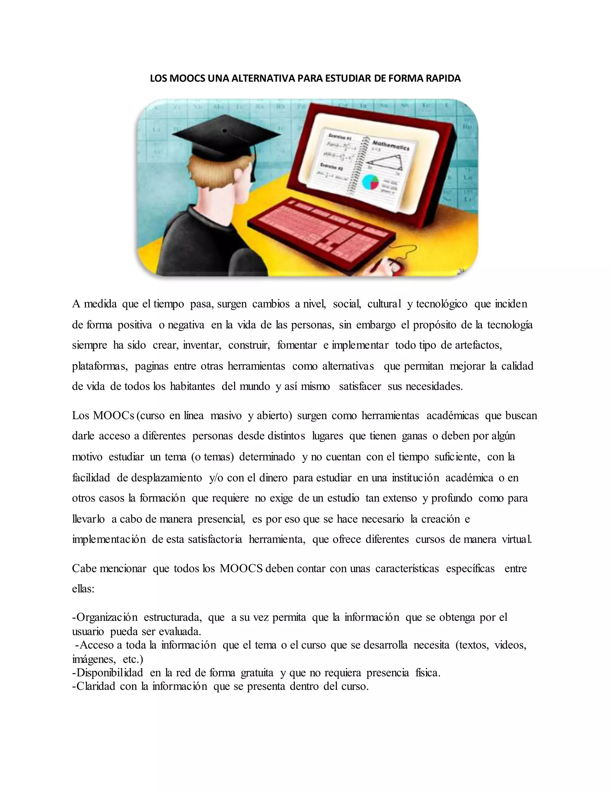 Los MOOCs (cursos en línea masivos y abiertos) surgen como herramientas académicas que buscan dar acceso a personas para estudiar temas determinados sin necesidad de asistir a una institución o cuando no se requiere un estudio extenso. Si bien los MOOCs ofrecen ventajas como flexibilidad y acceso gratuito, el documento argumenta que no son del todo satisfactorios para la educación porque no permiten desarrollar habilidades de trabajo en equipo e interacción social de la misma forma que la educación presencial