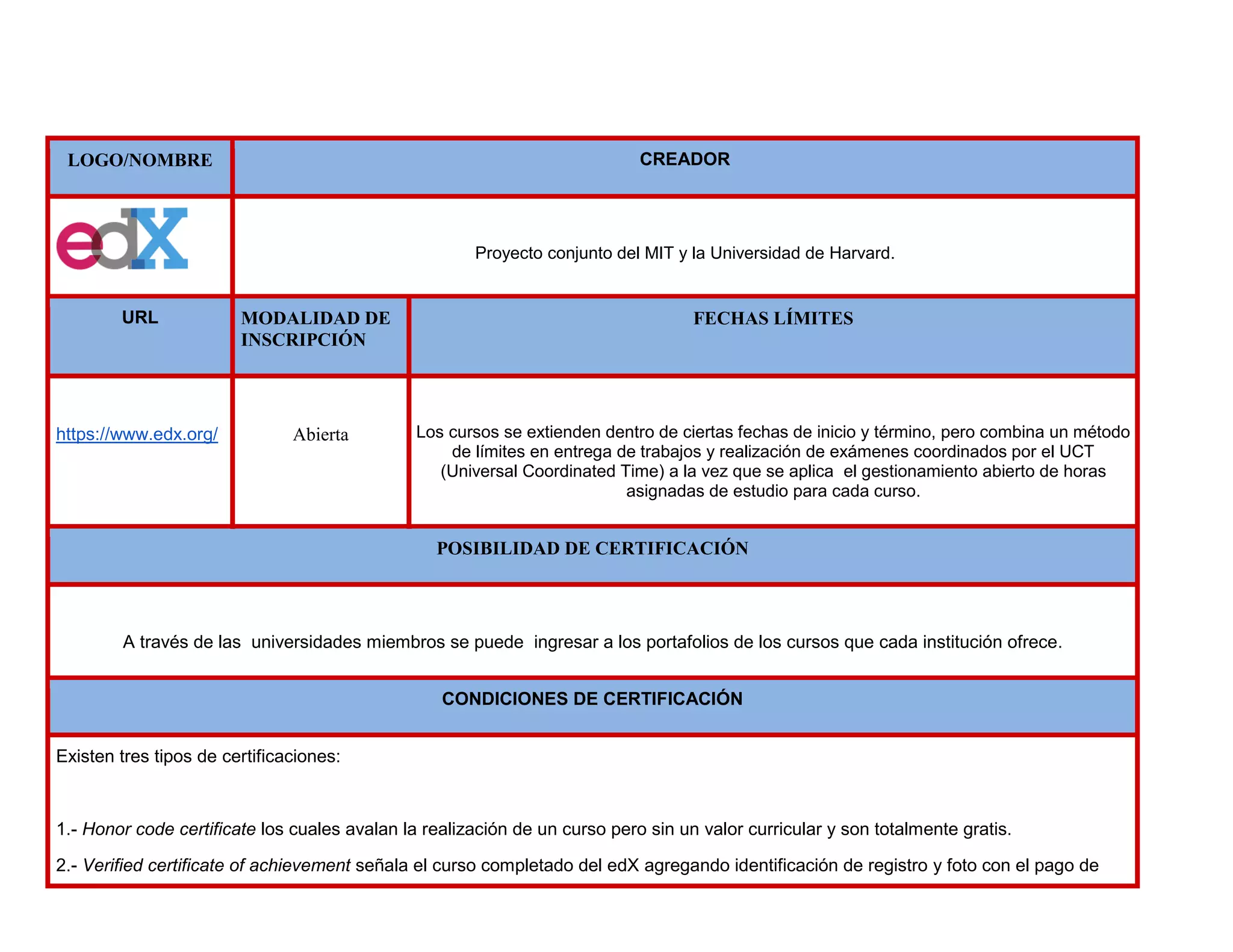 El documento describe tres plataformas de educación abierta en línea (MOOCs): edX, Coursera y MiríadaX. EdX es una plataforma creada por el MIT y Harvard que ofrece cursos gratuitos u opciones de certificación de pago. Coursera fue fundada por académicos de Stanford y ofrece certificados verificados mediante el pago de una tarifa. MiríadaX es una plataforma creada por el Banco Santander, Telefónica y Universia que ofrece certificados de participación gratuitos y cert
