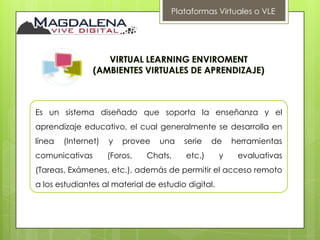 Este documento describe las plataformas virtuales de aprendizaje (VLE), incluyendo que son sistemas diseñados para soportar la enseñanza y el aprendizaje en línea a través de herramientas de comunicación y evaluación. También describe los sistemas de administración de contenido y cursos, así como ejemplos específicos como Moodle, un popular sistema de gestión de aprendizaje.