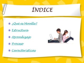 Moodle es una plataforma de aprendizaje en línea abierta que permite a docentes crear cursos con una variedad de recursos educativos como foros, cuestionarios y archivos. Los cursos en Moodle están organizados en temas, actividades y categorías para brindar contenidos de manera estructurada a los estudiantes. El sistema ofrece controles completos a los docentes y reportes de actividad de cada estudiante, además de características como correo electrónico, copias de seguridad y organización de la información.