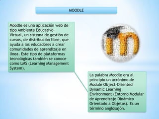 Moodle es una aplicación web gratuita tipo LMS (Sistema de Gestión del Aprendizaje) que ayuda a los educadores a crear comunidades de aprendizaje en línea. Fue creado por Martin Dougiamas en Australia y promueve una pedagogía constructivista social a través de la colaboración y actividades reflexivas. Moodle tiene una interfaz sencilla y es compatible con los principales sistemas de bases de datos, aunque su rendimiento depende de la configuración del servidor.