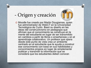 Moodle es una plataforma de aprendizaje en línea creada por Martin Dougiamas basada en ideas constructivistas. Permite a los educadores crear comunidades de aprendizaje online ofreciendo funciones como la publicación de cursos, ejercicios, blogs, foros y gestión de usuarios. Tiene como ventajas la disponibilidad de recursos actualizados y la comunicación bidireccional entre estudiantes y profesores.
