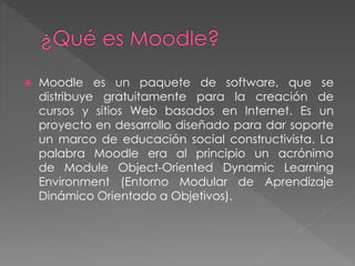 Moodle es un software educativo de código abierto creado por Martin Dougiamas para crear cursos virtuales y apoyar un marco constructivista de aprendizaje social. Permite a los maestros crear cursos online o usarlo como complemento a la enseñanza tradicional. Se puede personalizar y es escalable para satisfacer las necesidades cambiantes de las instituciones.