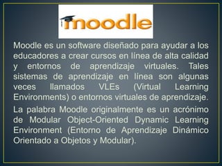 Moodle es un software diseñado para ayudar a los educadores a crear cursos en línea de alta calidad. Fue creado por el australiano Martin Dougiamas y se ha extendido a más de 100 países, traduciéndose a más de 50 idiomas. Ofrece a los estudiantes acceso a apuntes, debate y tareas que pueden entregar, además de permitir la creación de grupos de trabajo.
