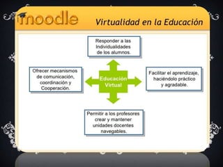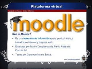 Moodle es una aplicación web gratuita de tipo LMS (Sistema de Gestión del Aprendizaje) que ayuda a los educadores a crear comunidades de aprendizaje en línea. Se basa en ideas constructivistas como que el conocimiento se construye en la mente del estudiante. Moodle permite a los profesores crear cursos en línea con diferentes recursos educativos y herramientas para la evaluación y comunicación. Es un software libre y multiplataforma que puede ser usado para apoyar la enseñanza presencial o completamente en