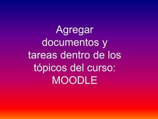 El documento proporciona instrucciones en 6 pasos para agregar documentos y tareas dentro de los tópicos de un curso en Moodle. Estos pasos incluyen seleccionar la opción de recursos o tareas, agregar un nombre y archivo, y guardar los cambios para completar la adición de contenido al curso en la plataforma Moodle.