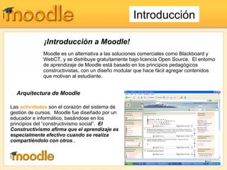 Este documento proporciona una introducción al sistema de gestión de aprendizaje en línea Moodle. Explica que Moodle es de código abierto y se basa en principios pedagógicos constructivistas. Detalla las diferentes actividades y recursos que ofrece Moodle, incluyendo foros, tareas, wikis, glosarios y cuestionarios. También describe cómo los profesores pueden crear cursos en Moodle asignando actividades y calificando el trabajo de los estudiantes.