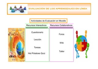 El documento aborda diversas actividades de evaluación en Moodle, incluyendo recursos interactivos como cuestionarios, lecciones y tareas, así como herramientas colaborativas como foros y wikis. Se destacan características como la aleatorización de preguntas, gestión de calificaciones y la posibilidad de fomentar un aprendizaje reflexivo y crítico entre los participantes. Además, se enfatiza la importancia de la evaluación diagnóstica, sumativa y formativa en el proceso educativo.