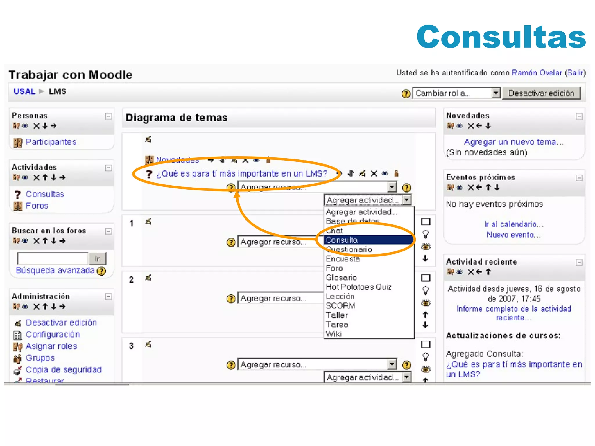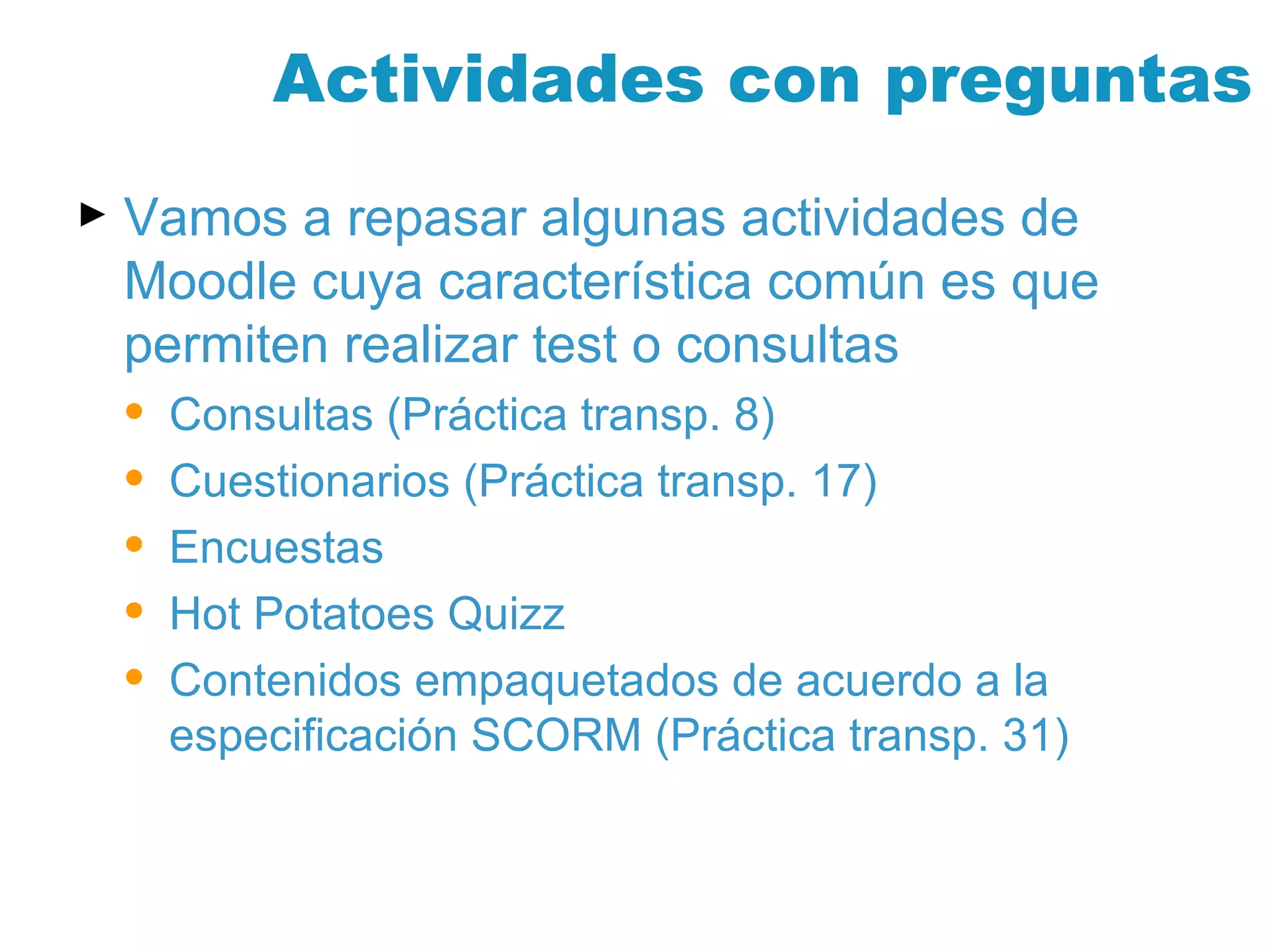 Actividades con preguntasVamos a repasar algunas actividades de Moodle cuya característica común es que permiten realizar test o consultas Consultas (Práctica transp. 8) Cuestionarios (Práctica transp. 17) Encuestas Hot Potatoes Quizz Contenidos empaquetados de acuerdo a la especificación SCORM (Práctica transp. 31)