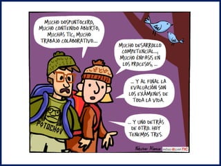El documento aborda la evaluación como un proceso integral en la educación, enfatizando su rol esencial desde la planificación hasta la finalización del aprendizaje. Se discuten diversas herramientas y enfoques, como el uso de Moodle, e-portfolios y wikis, destacando la importancia del feedback y la interacción en entornos colaborativos. Además, se subraya la necesidad de adaptar las evaluaciones a nuevas metodologías, alejándose de modelos tradicionales que limitan el aprendizaje colaborativo.