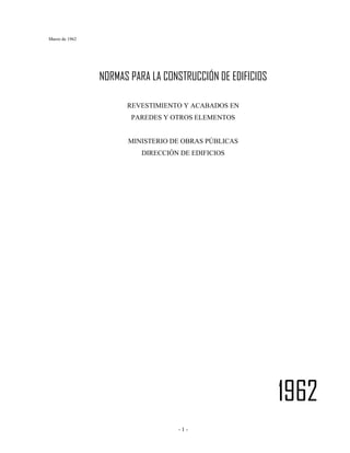 Este documento establece normas para revestimientos y acabados en paredes y otros elementos de construcción en Venezuela. Presenta normas para frisados y enlucidos realizados con cemento, cal o yeso, así como para revestimientos de piedra, materiales vidriados, cerámicos, acústicos, caucho, corcho y plásticos. Incluye un apéndice con ensayos para materiales como cal, yeso, granito y losas de porcelana. La comisión que elaboró este documento tuvo el objetivo de actualizar las norm