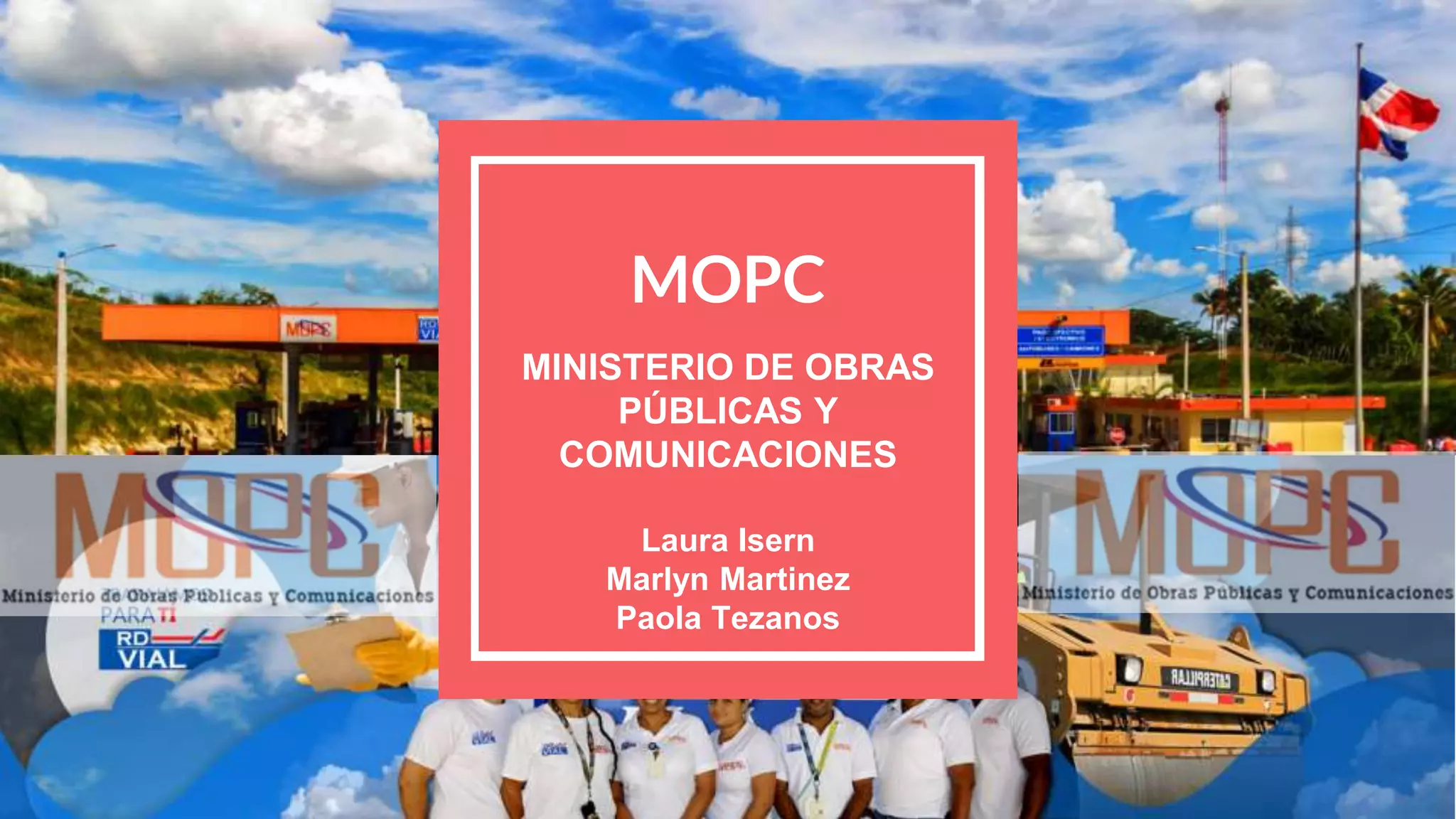 El Ministerio de Obras Públicas y Comunicaciones (MOPC) fue creado en 1954 y se encarga de la construcción, mantenimiento y mejora de la infraestructura de transporte, puertos y el tránsito terrestre en República Dominicana. El MOPC también revisa y aprueba los planos de edificaciones y establece las normas de diseño, construcción y calidad de materiales. Se ubica en Santo Domingo y sus principales funciones incluyen la construcción y reparación de obras de infraestructura, el control del