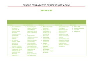 Este documento presenta un cuadro comparativo entre los modelos MOPROSOFT y CMMI. MOPROSOFT es un modelo mexicano para mejorar y evaluar procesos de desarrollo, mantenimiento y operación de sistemas de software, mientras que CMMI es un modelo internacional de procesos para la industria de software. El cuadro describe brevemente la historia, características, ventajas, desventajas y ejemplos de implementación de cada modelo.