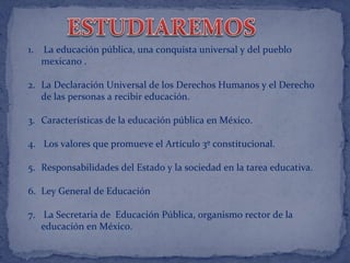 El documento describe la evolución histórica del derecho a la educación en México. Inicialmente, la educación era un privilegio para grupos selectos, pero a través de reformas constitucionales en el siglo XIX y principios del siglo XX, se estableció la educación pública, gratuita y obligatoria. La Constitución de 1917 definió a la educación como un derecho y obligación del Estado mexicano.