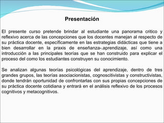 Este documento presenta un curso sobre teorías psicológicas del aprendizaje. El curso analiza teorías asociacionistas, cognitivistas y constructivistas, y cómo estas teorías pueden confrontarse con las concepciones de los docentes sobre su práctica. El objetivo es introducir a los estudiantes en los conceptos básicos de las teorías del aprendizaje y su historia. El curso se divide en unidades que exploran diferentes paradigmas educativos y teorías como el constructivismo.