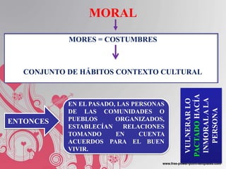 Este documento discute la moral y sus elementos. Define la moral como las costumbres y normas de conducta válidas para una persona o grupo social. Explica que la moral moldea la formación de la persona a través de la práctica recurrente de buenos hábitos. También identifica elementos clave de la moral como el deber moral, la conciencia moral y la responsabilidad moral. Finalmente, destaca la importancia de la moral en los estudiantes universitarios al contribuir al aprendizaje de juicios razonables y hábitos positivos.