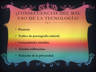 Este documento describe la importancia de la tecnología y la informática, menciona algunas consecuencias negativas del mal uso de la tecnología como la piratería y violación de privacidad. Define lo que es un computador y su función principal de procesar información de manera automatizada. Explica la diferencia entre hardware y software, y menciona cinco dispositivos de almacenamiento comúnmente usados. Finalmente, describe brevemente las funciones de algunos programas populares como Word, PowerPoint, Excel, Publisher y Movie Maker.
