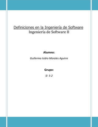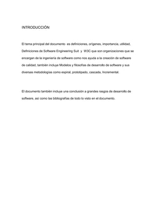 Este documento define la ingeniería de software y describe su importancia, utilidad y organizaciones clave como el Software Engineering Institute y W3C. Explica diversos modelos de desarrollo de software como la cascada, prototipado, incremental y espiral. Finalmente, resume las etapas del ciclo de vida del desarrollo de software y los componentes de la arquitectura de software.