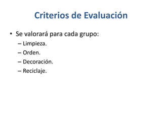 El documento describe los criterios de evaluación para un concurso de embellecimiento de aulas. Los criterios incluyen limpieza, orden, decoración y reciclaje. Se evaluará el estado de las superficies, la colocación de muebles, la decoración con carteles y la gestión adecuada de residuos.