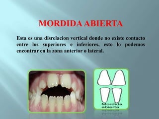 Este documento describe diferentes tipos de mordida abierta, incluyendo mordida abierta lateral, anterior, basal y con interposición de lengua. Explica las causas dentarias, musculares y esqueletales de cada tipo y los enfoques de tratamiento como aparatos funcionales, extracciones seriadas, tracción extraoral y cirugía ortognática cuando es necesario. La terapéutica depende del tipo y causa subyacente de la mordida abierta.