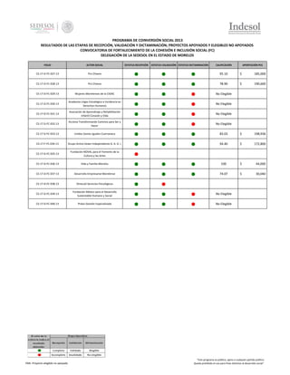 Este documento presenta los resultados de las etapas de recepción, validación y dictaminación de proyectos presentados para el Programa de Coinversión Social 2013 en Morelos, México. Se muestran 27 proyectos apoyados con diferentes montos de financiamiento, así como 13 proyectos elegibles pero no apoyados. El objetivo del programa es fortalecer la cohesión e inclusión social en la región.