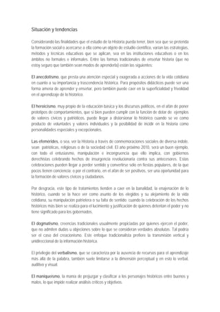 El documento discute la necesidad de innovar los métodos de enseñanza de la historia para favorecer el aprendizaje. Actualmente se usan métodos tradicionales como el anecdotismo, heroicismo y efemérides que pueden caer en la superficialidad. También menciona el dogmatismo, verbalismo, maniqueísmo y cronologismo. Plantea preguntarse qué conservar, qué desechar y qué innovar. Explica que aprender historia puede usarse para forjar identidad, cohesión social o estudiar el pasado de forma académica