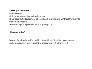 La morfina es un analgésico opiáceo que se utiliza para aliviar el dolor intenso. Actúa bloqueando la transmisión de estímulos de dolor en el cerebro y médula espinal. Puede causar efectos secundarios como somnolencia, náuseas, confusión y dependencia con su uso prolongado. Se administra principalmente por vía oral o parenteral para tratar el dolor asociado a infartos, cirugías u otras afecciones dolorosas.