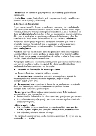 Este documento describe los procesos de formación de palabras en español, incluyendo la morfología, la estructura interna de las palabras y los mecanismos de derivación y composición. Explica que las palabras están formadas por unidades llamadas morfemas y que existen morfemas léxicos, gramaticales y derivativos. Además, resume los principales procesos de derivación como la prefijación, sufijación y composición para crear nuevas palabras a partir de raíces primitivas.