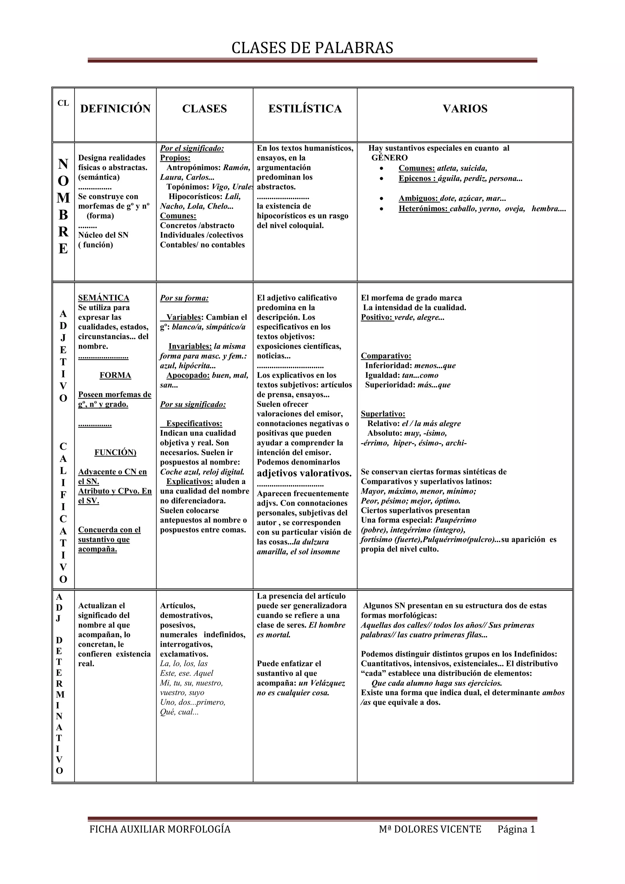 Este documento define y clasifica las principales clases de palabras en español: sustantivos, adjetivos, pronombres, verbos, adverbios, preposiciones y conjunciones. Describe sus características morfológicas, semánticas y sintácticas, incluyendo su forma, significado y función. También analiza aspectos como el género, número, caso, tiempo, modo, persona, grado y tipos como calificativos, determinativos, etc.