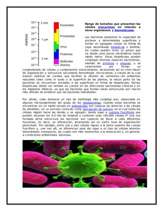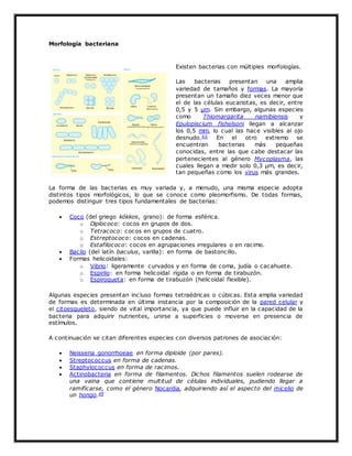 Las bacterias presentan una amplia variedad de formas y tamaños. La mayoría son más pequeñas que las células eucariotas, midiendo entre 0,5 y 5 μm, aunque algunas pueden medir hasta 0,5 mm y ser visibles a simple vista. Las formas bacterianas incluyen cocos, bacilos, vibrios, espirilos y espiroquetas. Su morfología depende de la pared celular y el citoesqueleto, y puede influir en su capacidad para adquirir nutrientes y moverse. Algunas bacterias pueden