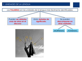 Este documento describe las unidades fundamentales de la lengua y los procesos de formación de palabras. Explica que los morfemas son las unidades más pequeñas de significado y que pueden ser léxicos o gramaticales. También describe las clases de palabras y los procesos de formación como la derivación, composición y parasíntesis. Finalmente, analiza las características morfológicas, semánticas y sintácticas de las diferentes clases de palabras.