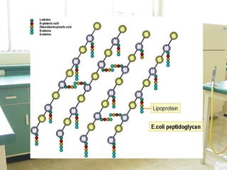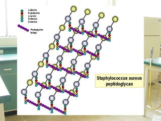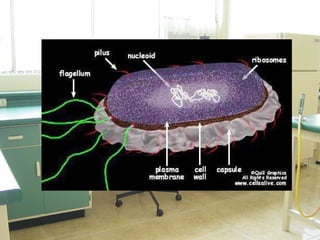 El documento presenta una descripción general de la estructura y morfología bacteriana. Explica la clasificación, características y tamaños de las bacterias, así como las diferentes formas que pueden adoptar (cocos, bacilos, espirales, filamentosas). Describe las principales estructuras bacterianas permanentes como la pared celular, membrana citoplasmática y citoplasma, e incluye detalles sobre sus componentes y diferencias entre bacterias gram positivas y negativas. Finalmente, señala las estructuras variables como flagelos