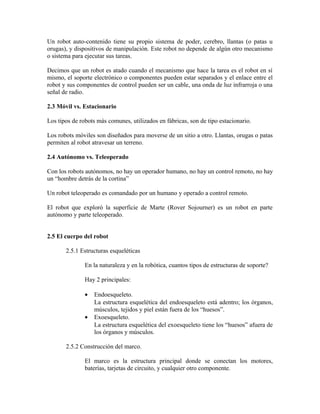 Este documento describe las partes principales que componen el cuerpo de un robot, incluyendo su estructura, sistema de energía, locomoción y sensores. Explica que la estructura puede ser de metal, plástico o madera y tener forma de caja, cilindro u otra. Los sistemas de locomoción comunes son llantas, patas y orugas. Los robots usan baterías como fuente de energía principal, pero también pueden usar energía solar. Entre los sensores se mencionan la visión, el tacto y la audición.