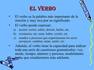 El documento describe la morfología del verbo en español. Explica que el verbo se compone de una raíz léxica y morfemas verbales que indican voz, modo, tiempo, número y persona. También distingue entre verbos regulares e irregulares y explica las tres conjugaciones verbales en español.