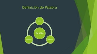 El documento aborda la morfosintaxis y ofrece una clasificación de las palabras según sus características gramaticales. Se distingue entre palabras variables, que tienen accidentes gramaticales como género y número, e invariables, que carecen de estos accidentes. También se menciona la definición de palabra desde una perspectiva lógico-gramatical y psicológica.